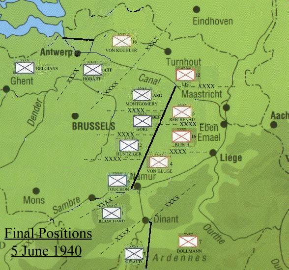 Aftermath By 5 June the last German units, namely the 7th Panzer Division, made it through the Namur Corridor. The Germans, however, were given little rest as following the 7th Panzer were the BEF & the 6th & 2nd French Armies. Thus the Germans were forced to quickly establish a defensive line from Namur to the Albert Canal in the north. Having said that the Germans need not have worried about an Allied attack. Like the Germans, the Allies were exhausted. Only the French 2nd Army was at relatively full strength, but it was in no position to attack the entire German line. Unlike everyone else, though, Hitler had other ideas. Although it was a welcomed addition to the exhausted German forces, & further good reason for the Allies not to attack, the German 7th Army came with orders to attack through the Ardennes. Von Rundstedt could not believe what Hitler wanted & announced to all at his headquarters "Attack with the 7th Army towards Paris? If it should even get across the Meuse we should go down on our knees and thank God!" Instead the 7th Army would face off against Giraud's 7th French Army & protect the southern flank of the German 4th Army defending Namur. The Germans, though, need not have worried as Giraud was in no condition to launch a major attack anytime soon. In fact the front line, settled upon on 5 June, would remain that way for months to come.